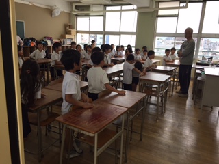 1年生は6年生といっしょに6年生の教室へ避難します。他の学年も、それぞれ決められた場所へ静かに移動をしました。