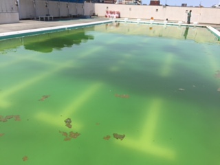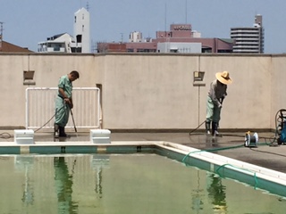 今、屋上のプールは、緑色の水で満杯です。今日、管理作業員さんが、手始めにプールの清掃を始めてくださいました。