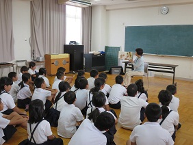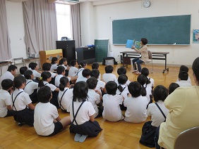 今日(7月10日)、平野図書館のボランティアさんにお越しいただいて、6年生の「おはなしたからばこ」がありました。