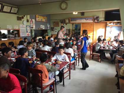 集い、ラジオ体操、朝食を済ませ本日の活動についてのお話を聞いています。