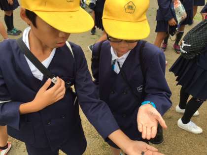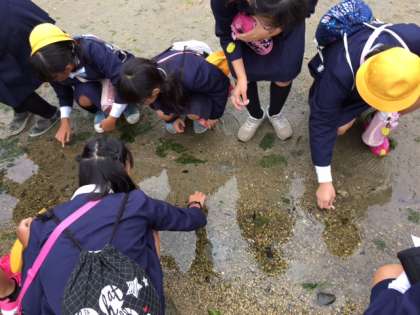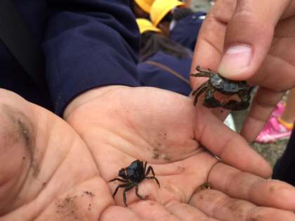 鳥居の辺りの干潟で磯観察が始まりました。たくさんのヤドカリや、大小様々な大きさのカニを