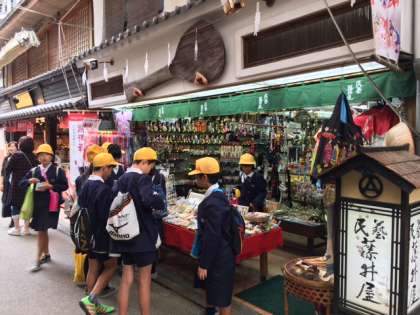 宮島でお土産物をグループごとに見ています。