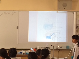 4年生の理科では、ノートを書画カメラで投影して、自分の考えを発表していました。