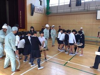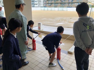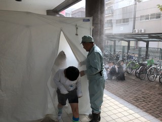 地域防災訓練では煙テント、水消火器の訓練、搬送訓練の3つを体験します。