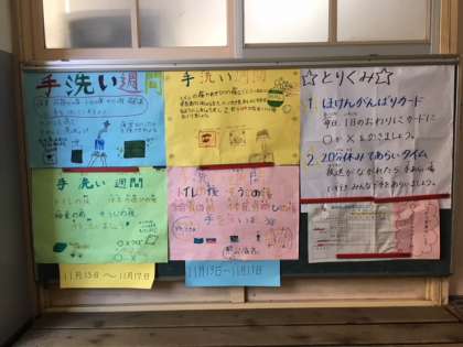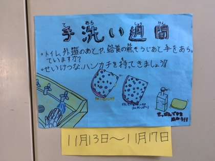 寒い時期に流行する「流行性感染症」や「インフルエンザ」等の予防のため、手洗い・うがいの大切さを知り実践する健康習慣を身につけるよう、児童朝会や20分休み、給食指導の始めに 保健委員会が呼びかけていました。
