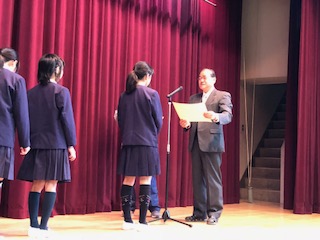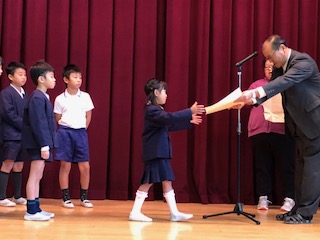 11月20日の朝会で、MOA美術館作品展の表彰式を行いました。夏休みに募集した作品に対して、賞をいただいたものの表彰です。書写24名、絵画24名が、金賞・銀賞をはじめ、賞をいただきました。中には産経新聞社賞、ひらのの巻賞、MOA美術館奨励賞など、一点だけしか与えられない賞をとった児童もいました。