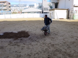 かけ足タイムの前に管理作業員さんが水たまりの所に土を入れて、子どもたちが安全に楽しく、かけ足ができるように準備してくださっていました。