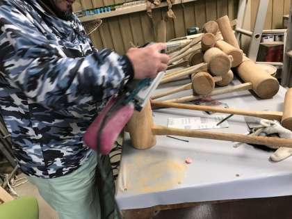 12月10日(日)に行われる「親子ふれあいもちつき大会」にむけて、管理作業員さんが、おもちに杵の木のくずが入らないように丁寧に磨いてくださっています。