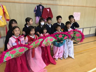12月5日〜7日まで、体育館を使って、サラムの集いをおこなっています。サラムの集いは、隣の国の韓国・朝鮮の遊びや楽器、衣類などに触れて、理解を深める取り組みです。各学級1時間ずつ行います。