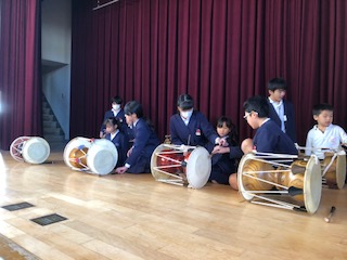 韓国・朝鮮では農繁期が終わった後、プンムルという祭りがあります、そこで、使われているのが、頭を回して帽子のひもを回すサンモや楽器です。新平野小学校にはチン、ケンガリ、チャンゴ、プク、ソゴの5つの学期があります。