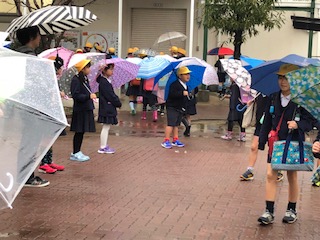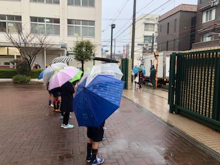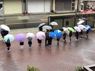 傘の花が咲く 雨の日のあいさつ運動 3年2組