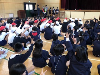先生が声色を変えて録音した台詞を、3年生と6年生の子ども達が当てます。全問正解が一人もいないほどの難問に、講堂は沸いていました。