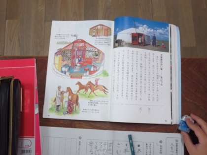 3年教室では、国語科「人をつつむ形ー世界の家づくり」で学習していました。世界の家の「大草原の白い家ーモンゴル」の説明文を読んで、ワークシートに使って、書かれてある内容をまとめる活動です。