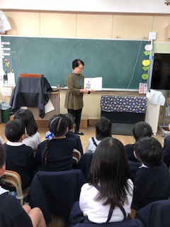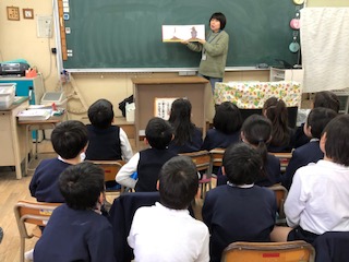 平野図書館の方を迎えて、今日は教室で読み聞かせをしてもらいました。