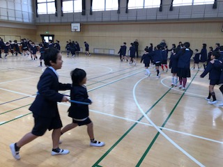今朝(2月15日)は2年生と5年生がペア鬼ごっこ集会を楽しみました。