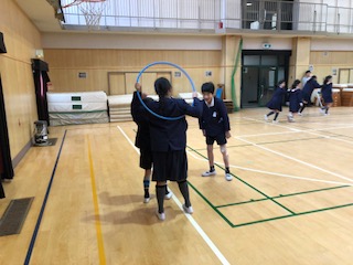 2年生が前、5年生が後ろで肩を持って並びます。フープの中に入っているペアは鬼です。逃げる方もペア、鬼もペアで、捕まるとフープを渡して鬼の交換です。
