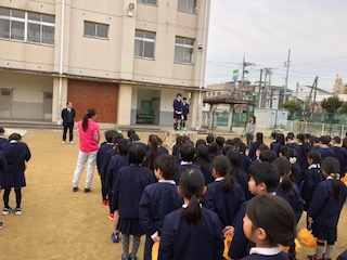 2月19日。運動場で朝会をしました。校長先生から、「今日は24節気では雨水(うすい)。雪から雨に変わる時期です。」「平昌オリンピックでうれしいできごとがありました。」と話をいただきました。