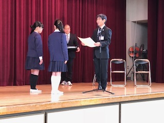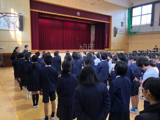 2月26日。今朝の児童朝会に平野区長様が来校されて、本校で取り組んでいるあいさつ運動と、平野区で取り組んでいる読書ノートにしっかりと取り組んだ児童に対する表彰がありました。そのようすをご覧ください。