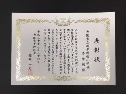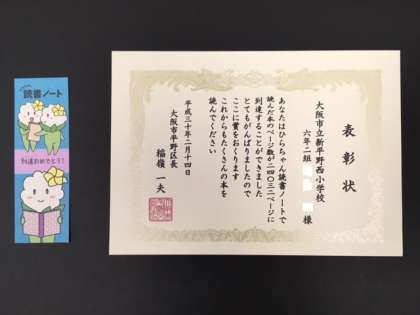 本日(26日)の児童朝会で、平野区長様から表彰された「善行表彰賞」(あいさつ運動)と読書ノート到達者69名の表彰状を紹介します。