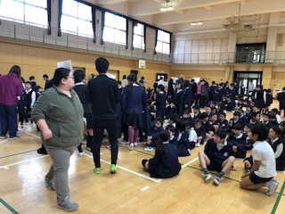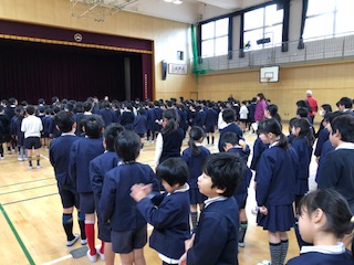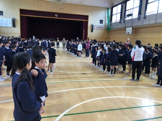 今日の児童集会では、明日の卒業を祝う会に向けた並び方の確認や、全体の流れの確認などを行いました。