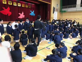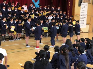 地区班の1年生から5年生が書いたカードを渡しました。また、6年生からは学校をきれいにしてほしいとの願いを込めて、雑巾がプレゼントされました。