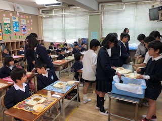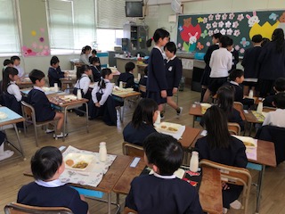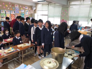 6年生が配膳のてつだいをしてくれて、給食が配られるのを待っています。
