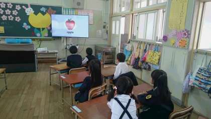 今日は、今年度最初の朝の英語活動の時間。一年生も英語のDVDを視聴しました。