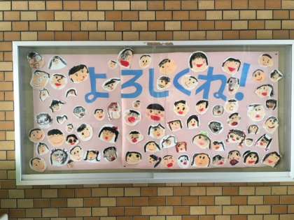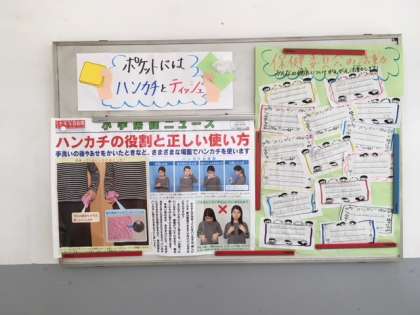 玄関の掲示物の1年生75名のの「よろしくね!」と、保健室前の「保健委員会の活動紹介とハンカチの役割の使い方」です。ご覧ください。