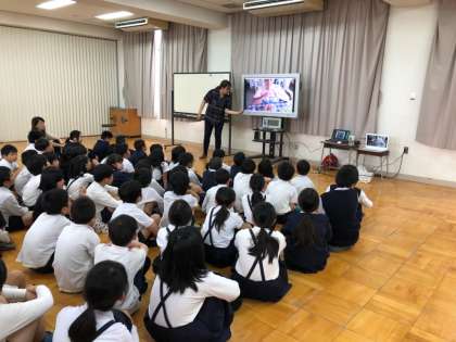 今日(24日)4年生がはじめての英語学習を行いました。