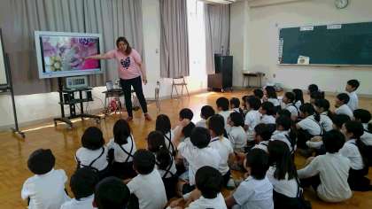 C−NETの先生が、「My town is durian town.」とドリアンが有名な町であることを伝えると、『ドリアンの町なん!?』と英語を聞き取っている児童もいました。