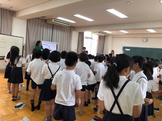 歌でアイスブレーキングをした後、今年度から英語教材になる「LET’S TRY」であいさつの練習から始めました。