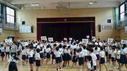 明日は、体操服、水筒(肩ひも付き)、汗ふきタオル(水筒の肩ひもに結ぶ)が必要です。忘れないようにお子さんに持たせてください。雨天の場合は、校内オリエンテーリングに変更になります。