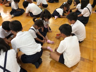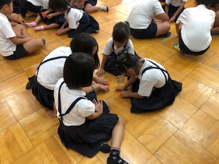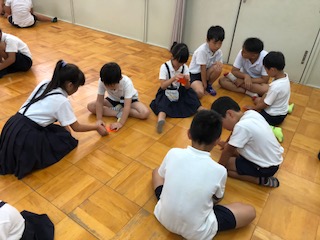 8月6日の平和登校日に、6年生が広島の平和祈念館へ納める折鶴を全校児童で折ります。今日(17日)は、5年1組が2年1組に折鶴の折り方を教えてくれました。様子をご覧ください。
