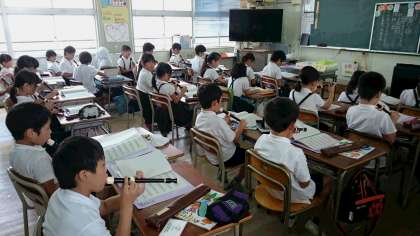 子どもたちは、先生の伴奏に合わせて一生懸命にリコーダーを演奏していました。この日の練習曲は「ブラックホール」でした。くり返し練習するうちに少しずつ吹けるようになっていました。