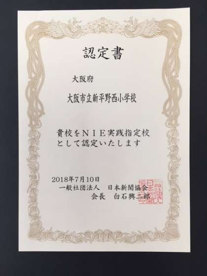 日本新聞協会から2018年度NIE実践指定校の認定を受けました。