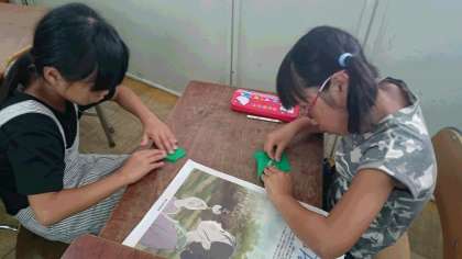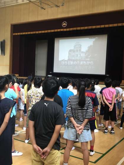 その後、1〜4年生は教室で戦争に関するDVDを見て、平和への願いを込めて折り紙で鶴を折りました。5・6年生は、語り部さんから戦時中のお話を聞きました。戦時中の体験を直接聞く機会は、非常に貴重です。真剣に話を聞いている子どもたちの様子が印象的でした。