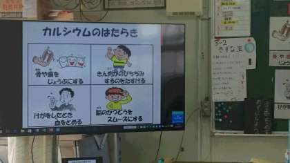 9月3日に、栄養教育がありました。3年生は、カルシウムについて学びました。牛乳に多く含まれているカルシウム。25歳を過ぎるとカルシウムをたくさん摂取しても体内に吸収される量が減っていくそうです。健康な骨と骨粗しょう症の骨の断面図を見比べて、子どもたちは驚いていました。