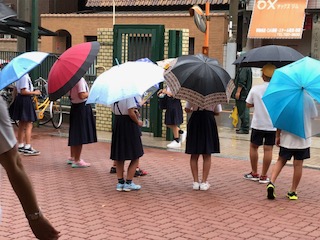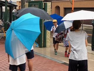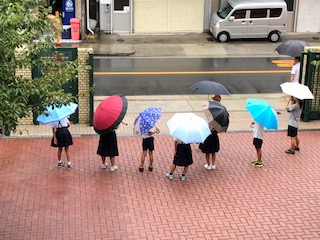 10日(月)。雨の朝ですが、今日から5年2組があいさつ運動に取り組んでいます。
