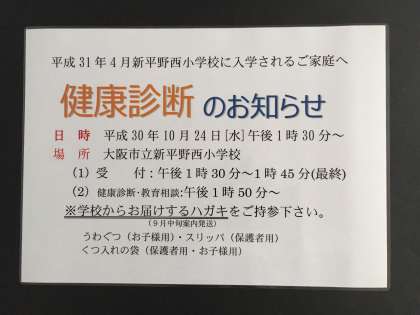 本校の就学時健康診断開催の通知はがきが、9月下旬頃に各家庭に、大阪市教育委員会を通じて郵送されますので、ご一読いただき、当日の参加予定をよろしくお願いいたします。