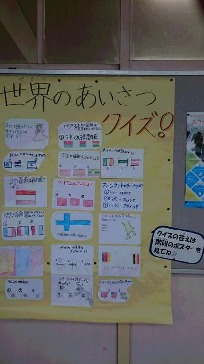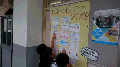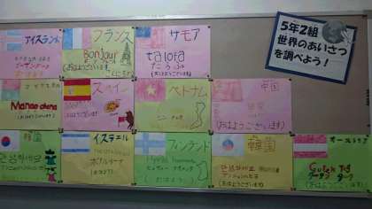 今週は、5年2組があいさつ運動の担当です。正門でのあいさつの呼びかけに加えて、世界のあいさつについて調べました。国旗やその国で使われている言葉を画用紙にまとめました。職員室前には、あいさつクイズも貼り出し、さっそく1年生が見に来ていました。