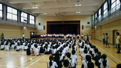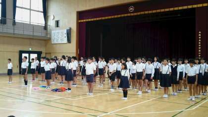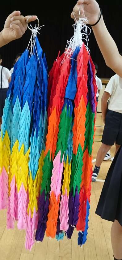 6年生は、来週、広島へ修学旅行に行きます。木曜日の集会では、6年生から折り鶴の披露がありました。これは、8月6日に行った平和人権登校日で全校児童で折ったものです。6年生が1つ1つ糸を通してくれました。これを広島で捧げてきます。