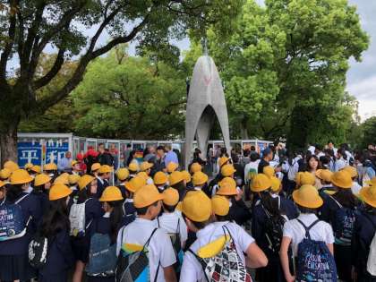 新平野西小学校のみんなで折った折り鶴を捧げました。6年生全員で「原爆の子の像」前で呼びかけをし、平和を祈りました。