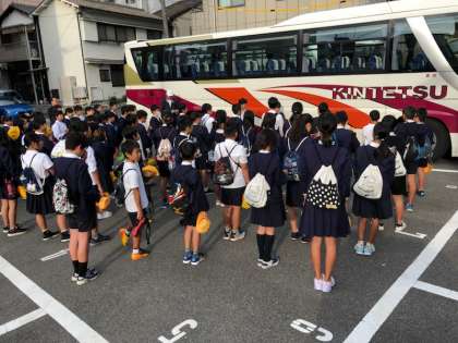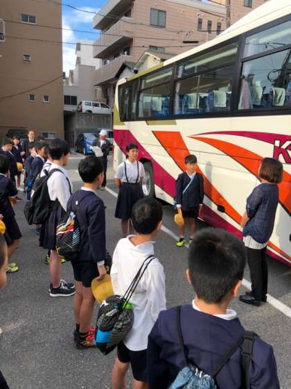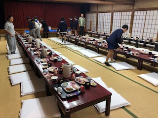 朝ご飯の準備の様子です。食事係の人がてきぱきと配膳しています。食事が済んだら、部屋を片付けて閉舎式です。木松旅館の方々、お世話になりました。宮島に向かって出発です。