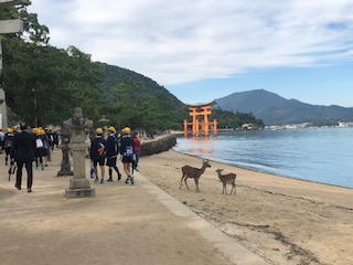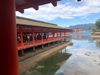 厳島神社に着きました。大きな鳥居は迫力があります。今日は天気も良いです。