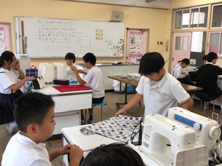 2組は家庭科室で「裁縫とミシン縫い」でお弁当のつつみを作りました。保護者さんと一緒に取り組んでいる様子が微笑ましかったです。