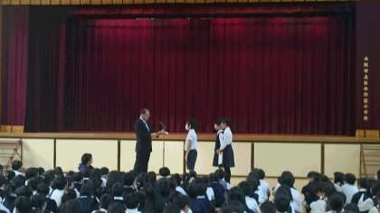今日の児童朝会では、学生科学賞の表彰がありました。夏休みに理科の自由研究をした児童の中から入賞者3名が表彰されました。校長先生からは、これを励みに今週の作品展や新平野西小まつりも進んで取り組みましょう、というお話がありました。