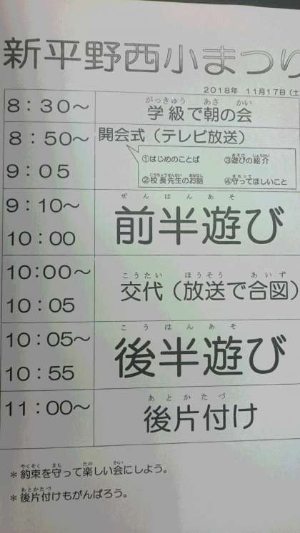 明日17日(土)は、土曜授業です。作品展と新平野西小まつりがあります。児童の登校時間は、普段と同じです。持ち物は、連絡帳でご確認ください。児童の下校時刻は11:30頃です。