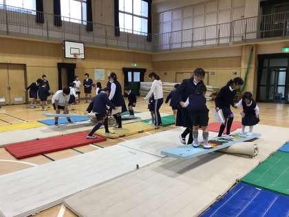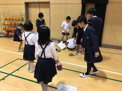 体育館で、民族衣装のチョゴリを着たり、チャンゴという太鼓をたたいたりしました。他にも、ノルティギ(シーソーのようなもの)やペンイ(こま)の遊びも体験しました。