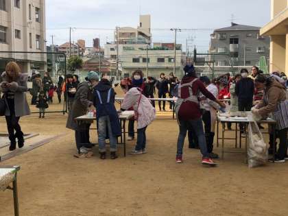 10時の開始前から、正門には子ども達が待ち遠しい様子です。開始時間ピッタリに合うように、PTA各委員会のお父さんお母さん方が、餅をつき、丸める作業を段取り良くこなされます。