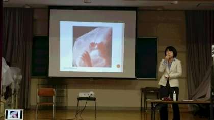 「あなたにとって一番大切なものはなあに?」『いのち』の問いかけから始まり、お腹の中で過ごす10か月間の赤ちゃんの様子についてお話してくださいました。写真の説明に加えて人形も用意してくだいました。人形を実際に持ってみて、お腹の中での成長を感じることができました。お話の中で「赤ちゃんは、一生懸命自分の力で生まれてきた」と言われた場面は、一人ひとりの生命力を感じさせられました。